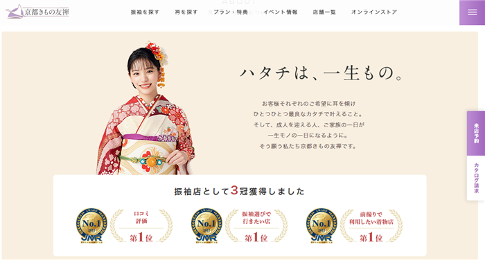 京都きもの友禅は、振袖店として3冠獲得しており、価格・品揃え満足度、前撮り満足度、口コミ満足度で第1位を獲得しています。